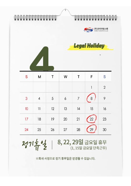 코리아텅스텐 2022년 4월 정기휴무 안내 - 수정 되었습니다.
