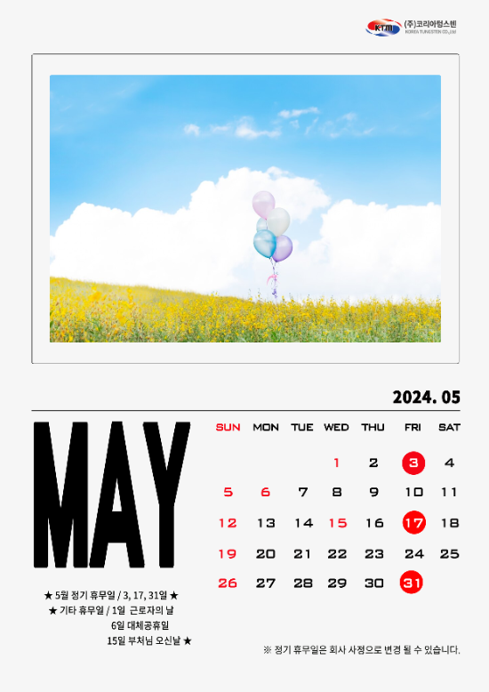 5월 코리아텅스텐 정기 휴무일 안내드립니다.