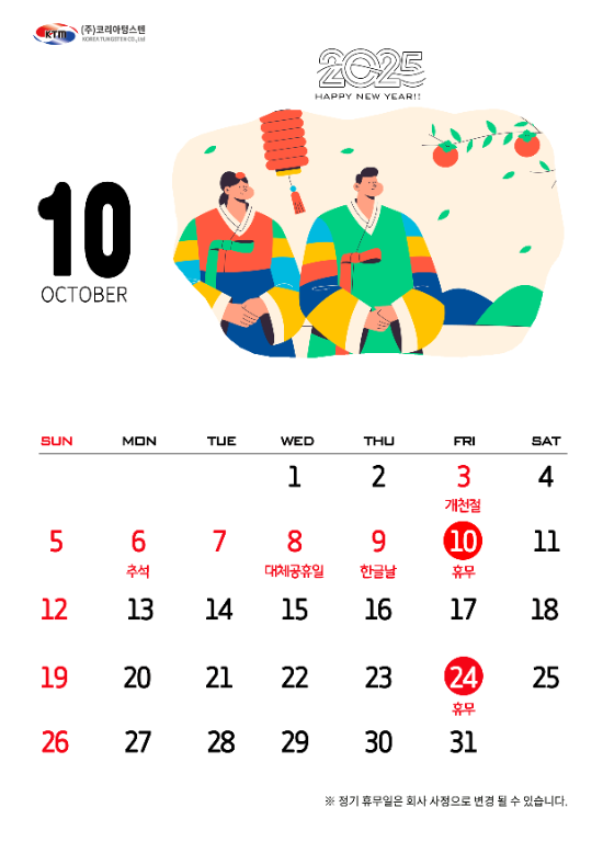 10월 코리아텅스텐 휴무일 안내 드립니다.